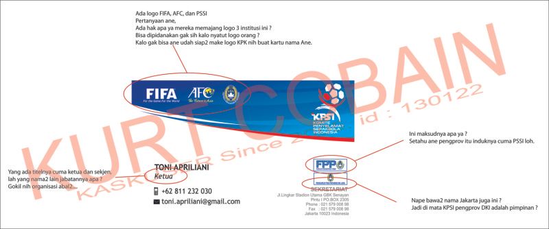 01. Ada trademark FIFA, AFC, dan PSSI Pertanyaan ane, Ada hak apa ya mereka memajang trademark 3 institusi ini ? Bisa dipidanakan gak sih kalo nyatut trademark pongid ? Kalo gak bisa cardinal udah siap2 attain trademark KPK nih buat kartu nama Ane. 02. Yang ada titelnya cuma ketua dan sekjen, lah yang nama2 lain jabatannya apa ? Gokil nih organisasi abal2.... 03. Nape bawa2 nama Djakarta juga ini ? Jadi di mata KPSI pengprov DKI adalah pimpinan ? Ini maksudnya apa ya ? Setahu cardinal pengprov itu induknya cuma PSSI loh. Spoiler for HOAX ???: yang bilang ini HOAX nih barbuk nya. Spoiler for Barbuk: